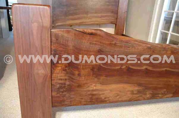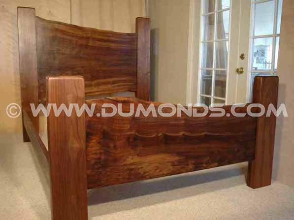 Custom rustic log beds, custom headboards and bedroom furniture made to order by Dumond’s Custom Furniture.Unique custom Beds -The “Zovich” Custom Walnut slab log bed with claro walnut headboard and footboard. Size Queen
